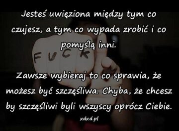 Jesteś uwięziona między tym co czujesz, a tym co wypada zrobić i co pomyślą inni. Zawsze wybieraj to co sprawia, że możesz być szczęśliwa. Chyba,...