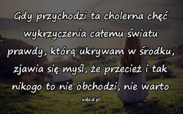 Gdy przychodzi ta cholerna chęć wykrzyczenia całemu światu prawdy, którą ukrywam w środku, zjawia się myśl, że przecież i tak nikogo to nie obchodzi, nie...