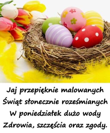 Jaj przepięknie malowanych Świąt słonecznie roześmianych W poniedziałek dużo wody Zdrowia, szczęścia oraz zgody.