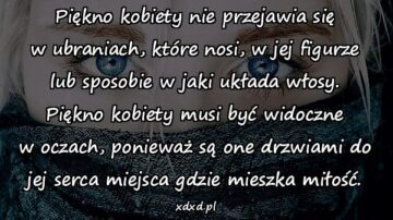 Piękno kobiety nie przejawia się w ubraniach, które nosi, w jej figurze lub sposobie w jaki układa włosy. Piękno kobiety musi być widoczne w oczach,...