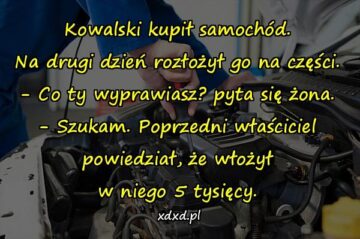 Kowalski kupił samochód. Na drugi dzień rozłożył go na części. – Co ty wyprawiasz? pyta się żona. – Szukam. Poprzedni właściciel powiedział, że włożył w...