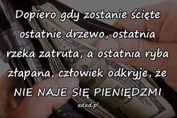 Dopiero gdy zostanie ścięte ostatnie drzewo, ostatnia rzeka zatruta, a ostatnia ryba złapana, człowiek odkryje, że NIE NAJE SIĘ PIENIĘDZMI