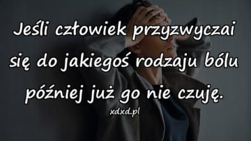 819 Cytaty o życiuPóźniej już go nie czujęJeśli człowiek przyzwyczai się do jakiegoś rodzaju bólu później już go nie czuję.