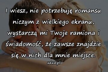 I wiesz, nie potrzebuję romansu niczym z wielkiego ekranu, wystarczą mi Twoje ramiona i świadomość, że zawsze znajdzie się w nich dla mnie miejsce.