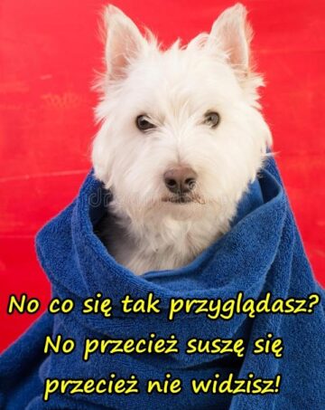 824 Śmieszne obrazkiSuszę się przecież nie widziszPies: No co się tak przyglądasz? No przecież suszę się przecież nie widzisz!