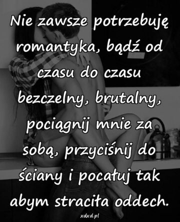 Nie zawsze potrzebuję romantyka, bądź od czasu do czasu bezczelny, brutalny, pociągnij mnie za sobą, przyciśnij do ściany i pocałuj tak abym straciła oddech.