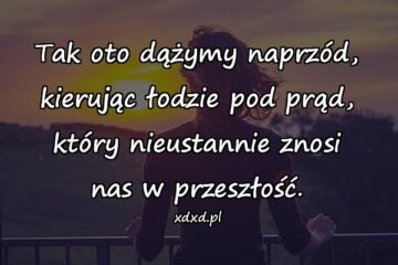 Tak oto dążymy naprzód, kierując łodzie pod prąd, który nieustannie znosi nas w przeszłość.
