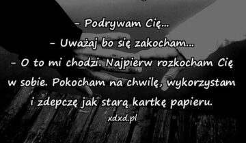 – Podrywam Cię… – Uważaj bo się zakocham… – O to mi chodzi. Najpierw rozkocham Cię w sobie. Pokocham na chwilę, wykorzystam i zdepczę jak...