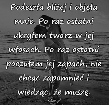 Podeszła bliżej i objęła mnie. Po raz ostatni ukryłem twarz w jej włosach. Po raz ostatni poczułem jej zapach, nie chcąc zapomnieć i wiedząc, że...