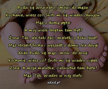 Budzi się żona rano i mówi do męża:nKochanie, wiesz co? Śniło mi się wiadro chuujów.nMąż z dumą pyta:nA mój wielki brytan tam był?nŻona: Tak, ale...