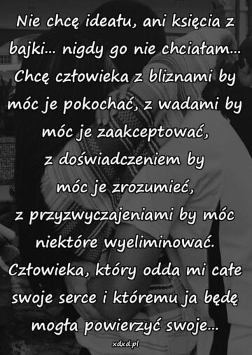 Nie chcę ideału, ani księcia z bajki… nigdy go nie chciałam… Chcę człowieka z bliznami by móc je pokochać, z wadami by móc je zaakceptować,...