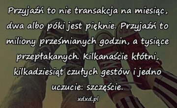 Przyjaźń to nie transakcja na miesiąc, dwa albo póki jest pięknie. Przyjaźń to miliony prześmianych godzin, a tysiące przepłakanych. Kilkanaście kłótni, kilkadziesiąt czułych gestów i...