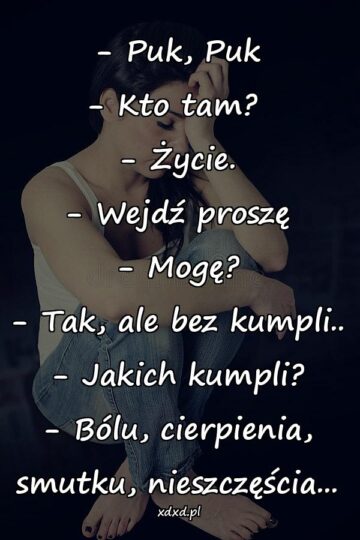 – Puk, Puk – Kto tam? – Życie. – Wejdź proszę – Mogę? – Tak, ale bez kumpli.. – Jakich kumpli? – Bólu, cierpienia, smutku,...