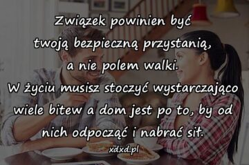 Związek powinien być twoją bezpieczną przystanią, a nie polem walki. W życiu musisz stoczyć wystarczająco wiele bitew a dom jest po to, by od nich...