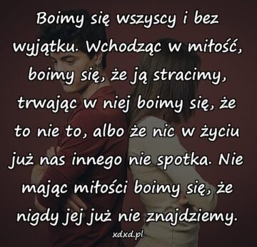 Boimy się wszyscy i bez wyjątku. Wchodząc w miłość, boimy się, że ją stracimy, trwając w niej boimy się, że to nie to, albo że...
