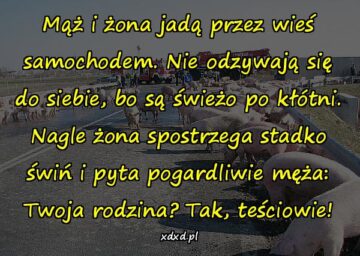 Mąż i żona jadą przez wieś samochodem. Nie odzywają się do siebie, bo są świeżo po kłótni. Nagle żona spostrzega stadko świń i pyta pogardliwie...
