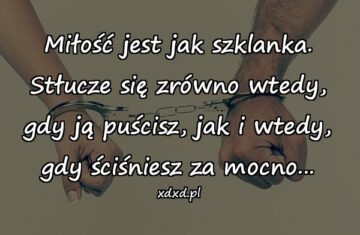 818 Cytaty o miłościMiłość jest jak szklankaMiłość jest jak szklanka. Stłucze się zrówno wtedy, gdy ją puścisz, jak i wtedy, gdy ściśniesz za mocno…