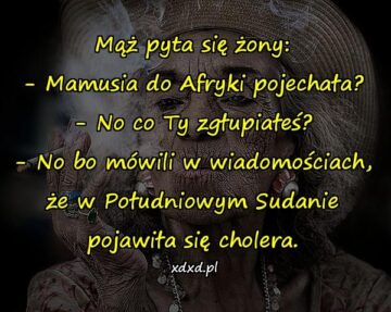 Mąż pyta się żony:n- Mamusia do Afryki pojechała?n- No co Ty zgłupiałeś?n- No bo mówili w wiadomościach, że w Południowym Sudanie pojawiła się cholera.