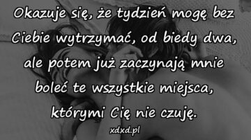 Okazuje się, że tydzień mogę bez Ciebie wytrzymać, od biedy dwa, ale potem już zaczynają mnie boleć te wszystkie miejsca, którymi Cię nie czuję.