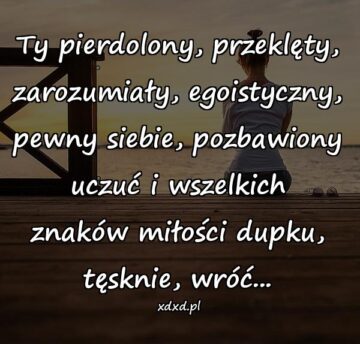 Ty pierdolony, przeklęty, zarozumiały, egoistyczny, pewny siebie, pozbawiony uczuć i wszelkich znaków miłości dupku, tęsknie, wróć…