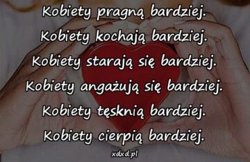 Kobiety pragną bardziej. Kobiety kochają bardziej. Kobiety starają się bardziej. Kobiety angażują się bardziej. Kobiety tęsknią bardziej. Kobiety cierpią bardziej.