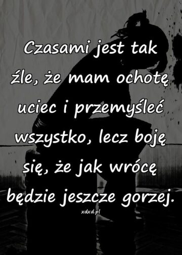 Czasami jest tak źle, że mam ochotę uciec i przemyśleć wszystko, lecz boję się, że jak wrócę będzie jeszcze gorzej.