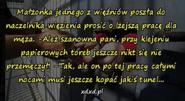 Małżonka jednego z więźniów poszła do naczelnika więzienia prosić o lżejszą pracę dla męża. -Ależ szanowna pani, przy klejeniu papierowych toreb jeszcze nikt się nie...