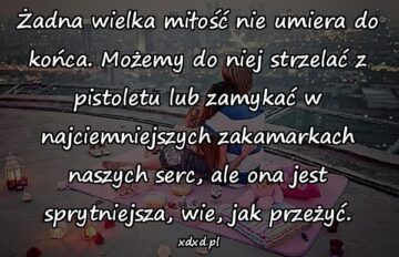 Żadna wielka miłość nie umiera do końca. Możemy do niej strzelać z pistoletu lub zamykać w najciemniejszych zakamarkach naszych serc, ale ona jest sprytniejsza, wie,...