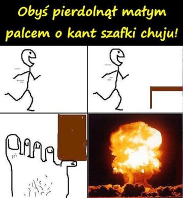 Obyś pierrdolnął małym palcem o kant szafki chuju!