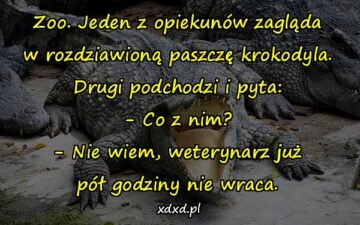 Zoo. Jeden z opiekunów zagląda w rozdziawioną paszczę krokodyla. Drugi podchodzi i pyta: – Co z nim? – Nie wiem, weterynarz już pół godziny nie...