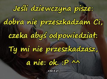 Jeśli dziewczyna pisze: dobra nie przeszkadzam Ci, czeka abyś odpowiedział: Ty mi nie przeszkadzasz, a nie: ok. 😛 ^^