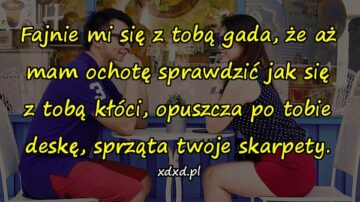 Fajnie mi się z tobą gada, że aż mam ochotę sprawdzić jak się z tobą kłóci, opuszcza po tobie deskę, sprząta twoje skarpety.