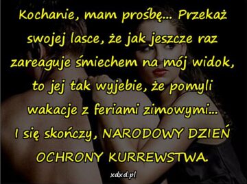 Kochanie, mam prośbę… Przekaż swojej lasce, że jak jeszcze raz zareaguje śmiechem na mój widok, to jej tak wyjebie, że pomyli wakacje z feriami zimowymi…...