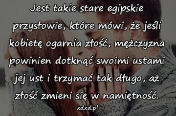 Jest takie stare egipskie przysłowie, które mówi, że jeśli kobietę ogarnia złość, mężczyzna powinien dotknąć swoimi ustami jej ust i trzymać tak długo, aż złość...