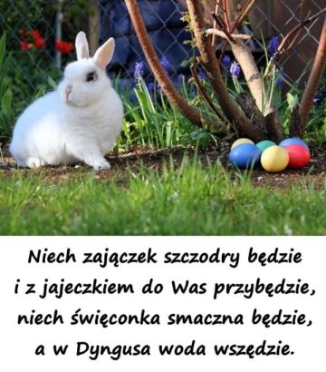 Niech zajączek szczodry będzie i z jajeczkiem do Was przybędzie, niech święconka smaczna będzie, a w Dyngusa woda wszędzie.