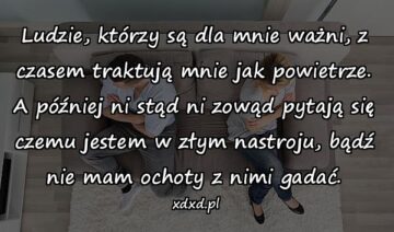 Ludzie, którzy są dla mnie ważni, z czasem traktują mnie jak powietrze. A później ni stąd ni zowąd pytają się czemu jestem w złym nastroju,...