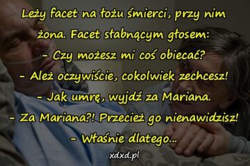 Leży facet na łożu śmierci, przy nim żona. Facet słabnącym głosem: – Czy możesz mi coś obiecać? – Ależ oczywiście, cokolwiek zechcesz! – Jak umrę,...