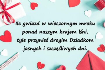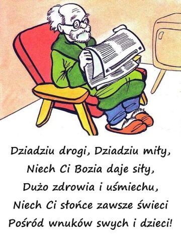 Dziadziu drogi, Dziadziu miły, Niech Ci Bozia daje siły, Dużo zdrowia i uśmiechu, Niech Ci słońce zawsze świeci Pośród wnuków swych i dzieci!