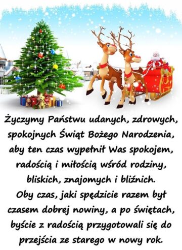 Niechaj magiczna noc Wigilijnego Wieczoru, Przyniesie Wam spokój i radość. Niech każda chwila Świąt Bożego Narodzenia, Żyje własnym pięknem, a Nowy Rok obdaruje Was, pomyślnością...