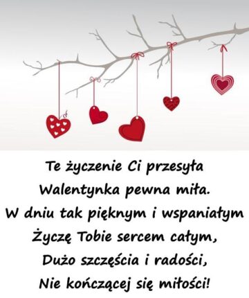 Te życzenie Ci przesyła Walentynka pewna miła. W dniu tak pięknym i wspaniałym Życzę Tobie sercem całym, Dużo szczęścia i radości, Nie kończącej się miłości!