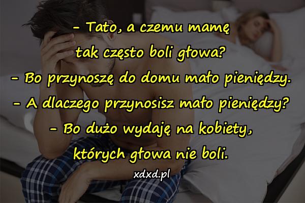 – Tato, a czemu mamę tak często boli głowa? – Bo przynoszę do domu mało pieniędzy. – A dlaczego przynosisz mało pieniędzy? – Bo dużo wydaję na kobiety, których głowa nie boli.