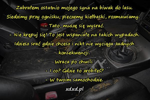 Zabrałem ostatnio mojego syna na biwak do lasu.nSiedzimy przy ognisku, pieczemy kiełbaski, rozmawiamy. n- Tato, muszę się wysrać.n- Nie krępuj się! To jest wspaniałe na takich wypadach. Idziesz srać gdzie chcesz i nikt nie wyciąga żadnych konsekwencji.nWraca po chwili:n- I co? Gdzie to zrobiłeś?n- W twoim samochodzie.