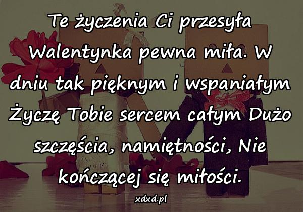 Te życzenia Ci przesyła Walentynka pewna miła. W dniu tak pięknym i wspaniałym Życzę Tobie sercem całym Dużo szczęścia, namiętności, Nie kończącej się miłości.