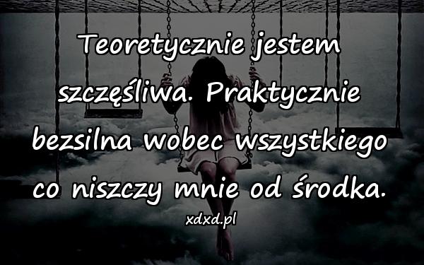 Home Cytaty Cytaty o życiu Teoretycznie jestem szczęśliwa. 2 lata ago 2 lata ago Cytaty o życiu Teoretycznie jestem szczęśliwa. autor: admin 47wyświetleń 824 824 points Teoretycznie jestem szczęśliwa. Praktycznie bezsilna wobec wszystkiego co niszczy mnie od środka. Pobierz obrazek Post PaginationPoprzedniPreviousNastępnyNext aforyzmy, besty, bezsilność, cytat, cytaty, cytaty o życiu, lovsy, mem, memy, obrazki, praktyka, rzeczywistość, sentencje, szczęściem, te myśli, teoria, życie Twoja reakcja? zmieszany 0 zmieszany porażka 0 porażka zabawne 0 zabawne zły 0 zły miłośc 0 miłośc fajne 0 fajne lol 0 lol omg 0 omg 0 komentarzy Anuluj pisanie odpowiedziTwój adres e-mail nie zostanie opublikowany. Wymagane pola są oznaczone * Zapamiętaj moje dane w tej przeglądarce podczas pisania kolejnych komentarzy.