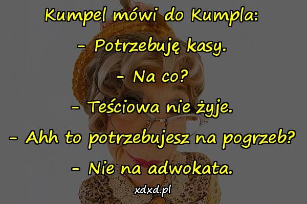 Kumpel mówi do Kumpla: – Potrzebuję kasy. – Na co? – Teściowa nie żyje. – Ahh to potrzebujesz na pogrzeb? – Nie na adwokata.