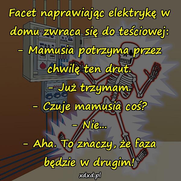Facet naprawiając elektrykę w domu zwraca się do teściowej: – Mamusia potrzyma przez chwilę ten drut. – Już trzymam. – Czuje mamusia coś? – Nie… – Aha. To znaczy, że faza będzie w drugim!