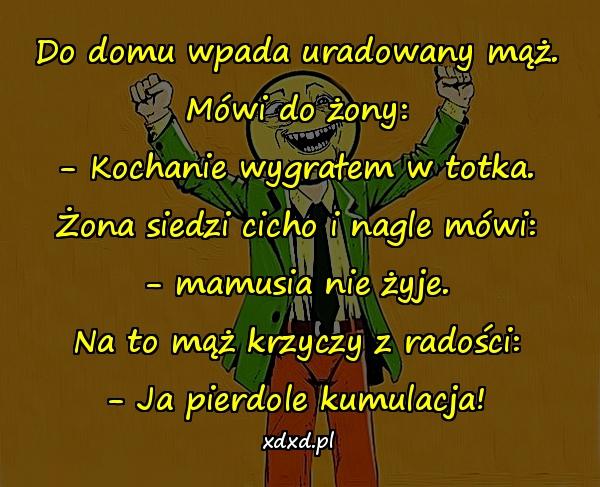Do domu wpada uradowany mąż. Mówi do żony: – Kochanie wygrałem w totka. Żona siedzi cicho i nagle mówi: – mamusia nie żyje. Na to mąż krzyczy z radości: – Ja pierdole kumulacja!