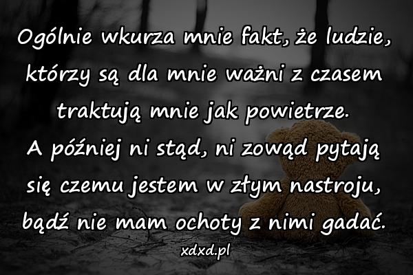 Ogólnie wkurza mnie fakt, że ludzie, którzy są dla mnie ważni z czasem traktują mnie jak powietrze. A później ni stąd, ni zowąd pytają się czemu jestem w złym nastroju, bądź nie mam ochoty z nimi gadać.