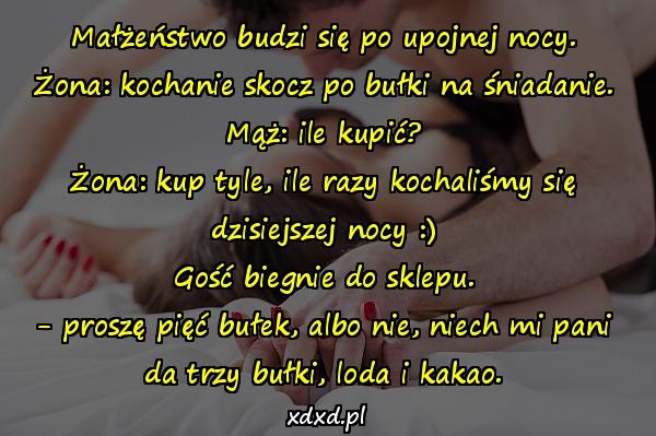 Małżeństwo budzi się po upojnej nocy. Żona: kochanie skocz po bułki na śniadanie. Mąż: ile kupić? Żona: kup tyle, ile razy kochaliśmy się dzisiejszej nocy 🙂 Gość biegnie do sklepu. – proszę pięć bułek, albo nie, niech mi pani da trzy bułki, loda i kakao.