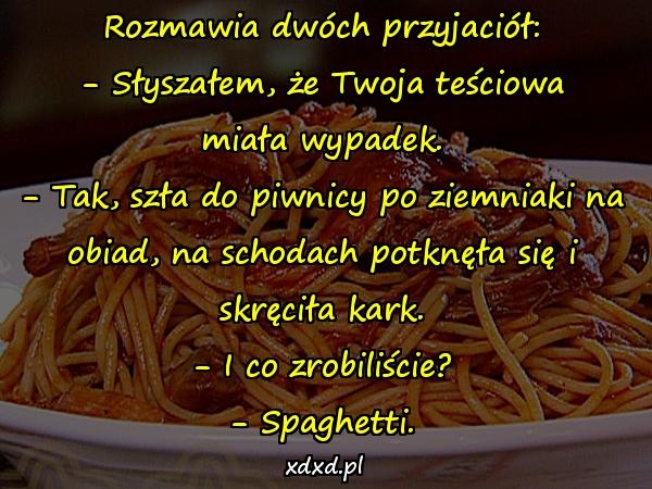 Rozmawia dwóch przyjaciół: – Słyszałem, że Twoja teściowa miała wypadek. – Tak, szła do piwnicy po ziemniaki na obiad, na schodach potknęła się i skręciła kark. – I co zrobiliście? – Spaghetti.